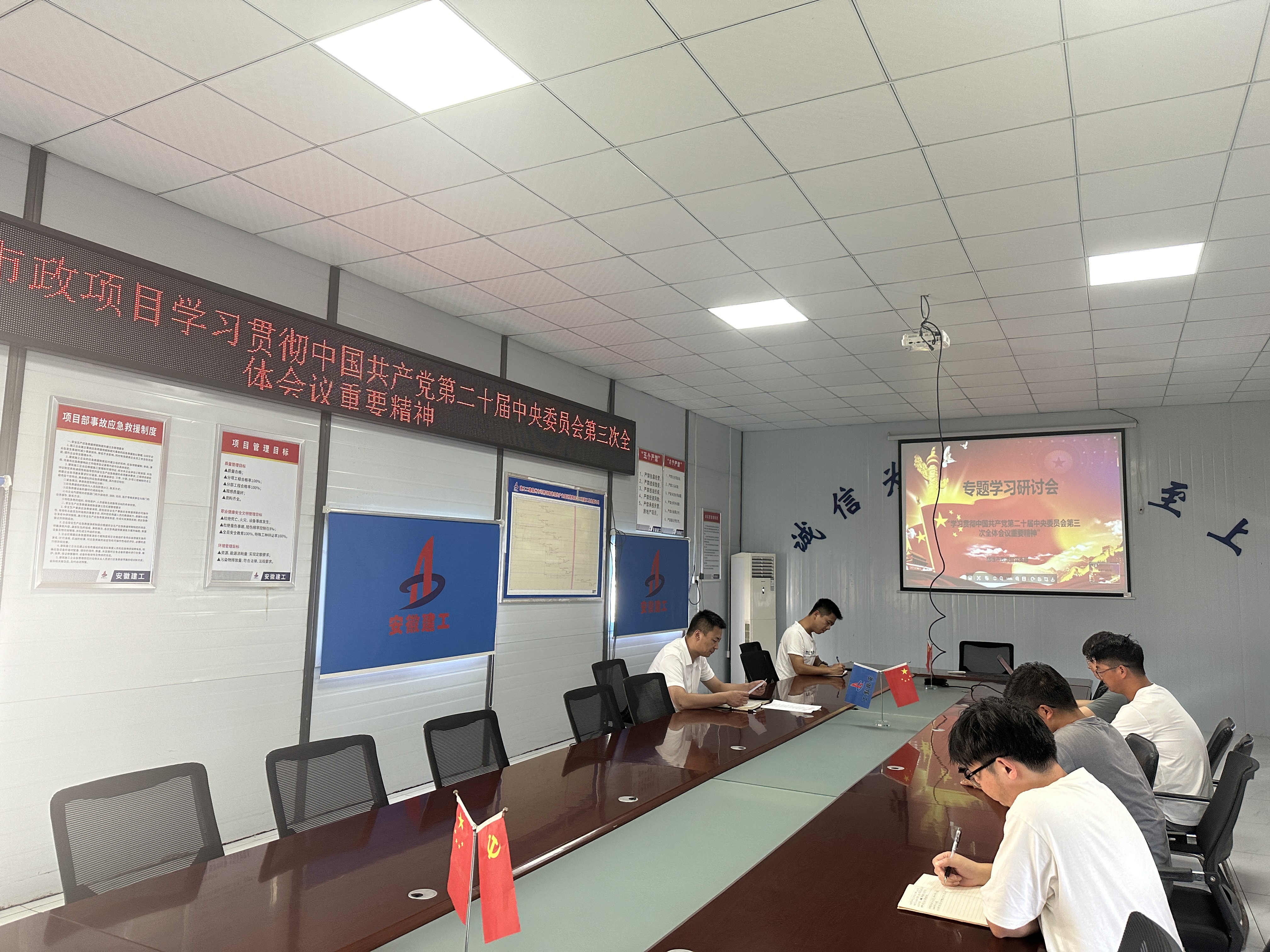 學習宣傳貫徹黨的二十屆三中全會精神,是當前和今后一個時期的重大政治任務。宿徐現代產業園市政項目黨支部認真學習、廣泛討論、深入交流,學習《中國共產黨第二十屆中央委員會第三次全體會議公報》,觀看文件解讀資料,并通過主題黨日、主題團日、座談會等共同研讀《黨的二十屆三中全會<決定>學習輔導百問》,并結合自身工作情況分享學習心得和體會,持續掀起學習貫徹黨的二十屆三中全會精神熱潮,推動黨的二十屆三中全會精神入腦入心、落地生根。