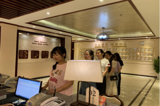 員工在體檢大廳有序領(lǐng)取體檢表