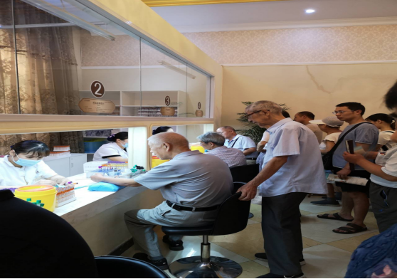 退休老職工排隊(duì)進(jìn)行抽血檢查