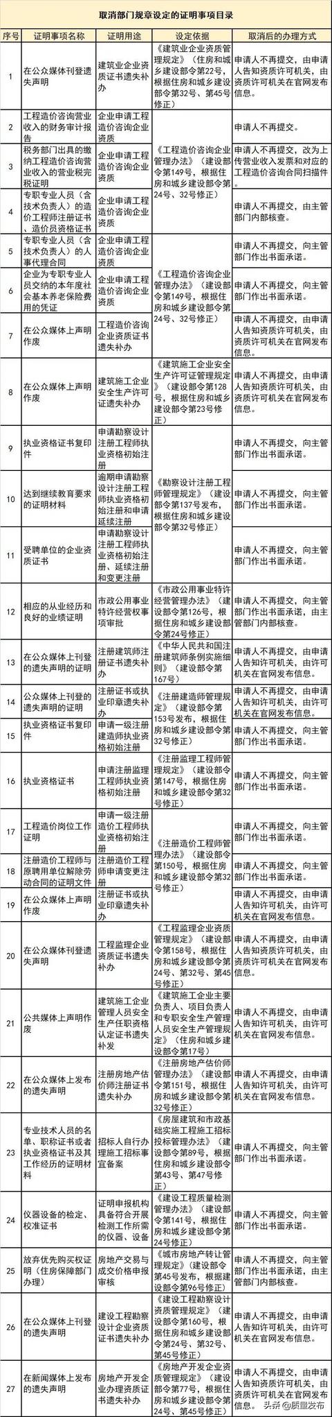 這次取消的力度很大,比如取消建設工程企業資質申報業績核查的證明,改為承諾。取消造價企業財務審計報告、完稅證明、專職人員證書、基本養老保險費用的憑證及其他相關證明材料等,部分證明改為承諾。