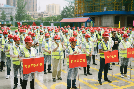 6月18日上午,安徽二建公司“戰疫情、搶工期、保目標、促超產”勞動競賽啟動儀式在淮北國金華府(紫麟苑)項目現場舉行?;幢笔凶〗ň痔瞥蔂I處長、副處長張喜明、質監站徐棟副站長、淮北市相山區住建局呂鵬宇局長、淮北國金置業有限公司董事長許偉應邀出席儀式。公司領導班子成員、機關相關部門人員及所屬各單位主要領導、分管安全領導等共計150余人參加活動,工會女工主任王俊主持啟動儀式。