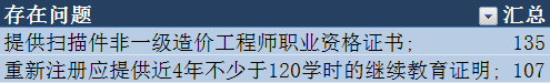 通過分析不符合條件人員的問題發(fā)現(xiàn),存在“提供掃描件非一級造價工程師職業(yè)資格證書”、“重新注冊應(yīng)提供近4年不少于120學(xué)時的繼續(xù)教育證明”這兩大問題的人員較多,分別為135人和107人,占所有不符合初始注冊條件人數(shù)的49.2%。