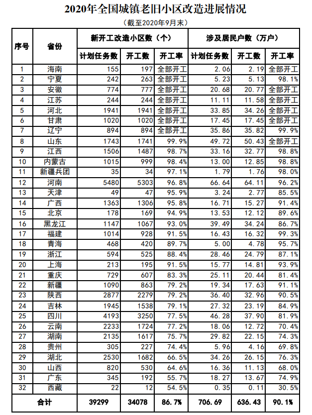 根據各地上報情況匯總統計,2020年1-9月份,全國新開工改造城鎮老舊小區3.41萬個,占年度計劃任務小區數的86.7%,較8月末提高了16個百分點;涉及居民636.43萬戶,占年度計劃任務戶數的90.1%,較8月末提高了13.8個百分點。
