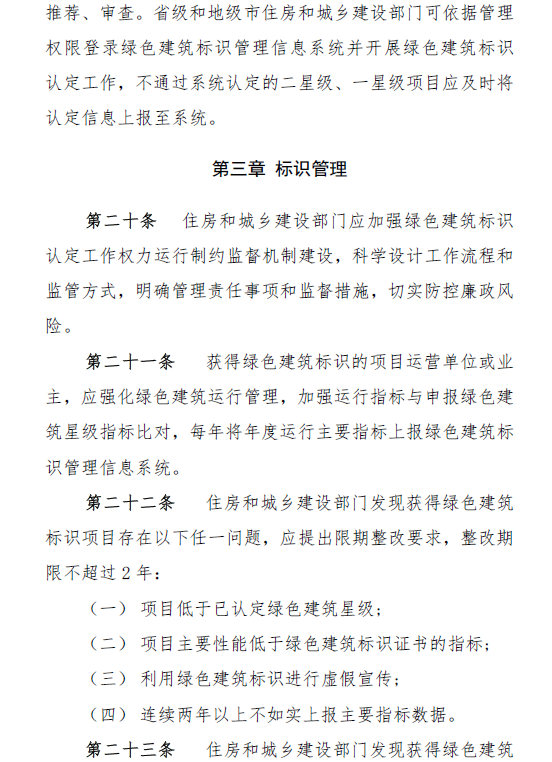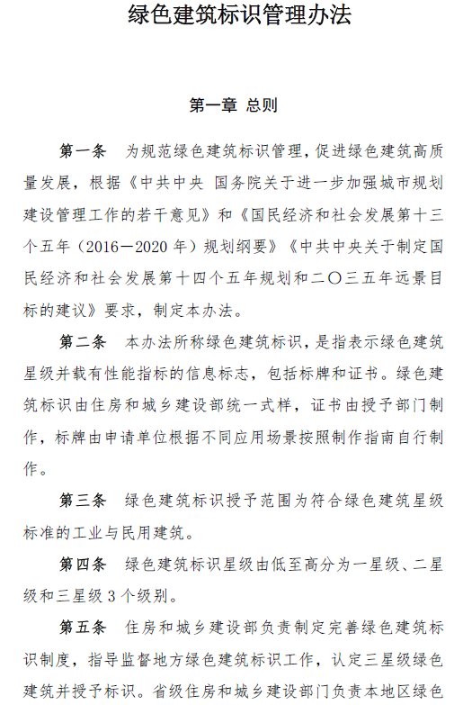 《辦法》規定,住房和城鄉建設部負責制定完善綠色建筑標識制度,指導監督地方綠色建筑標識工作,認定三星級綠色建筑并授予標識。省級住房和城鄉建設部門負責本地區綠色建筑標識工作,認定二星級綠色建筑并授予標識,組織地市級住房和城鄉建設部門開展本地區一星級綠色建筑認定和標識授予工作。