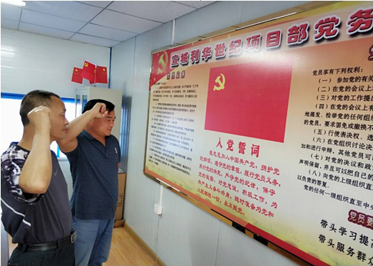 7月1日上午,項目部兩位黨員緊握右拳,面向鮮紅黨旗,重溫入黨誓詞。回顧入黨宣誓時的莊嚴承諾和堅定決心,增強黨性意識,以更加飽滿的熱情發揮共產黨員的先鋒模范作用,永葆共產黨的政治本色。項目部19名成員抒寫了“我的承諾”,將一腔熱血鐫刻在紅色信紙上,并莊嚴鄭重的張貼上了宣傳欄,接受同志監督,時刻提醒自己。不忘初心,立足崗位,提質降本增效,以實際行動向七•一獻禮。