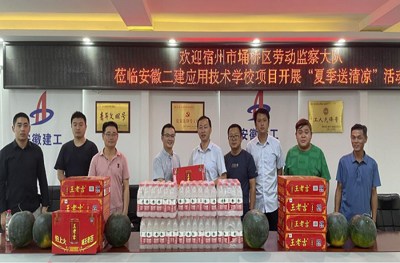 烈日炎炎,酷暑難當(dāng),為確保一線工人身心健康,督促做好夏季高溫期間安全生產(chǎn)工作,7月15日上午,宿州埇橋區(qū)勞動(dòng)監(jiān)察大隊(duì)黨支部書記、副大隊(duì)長王建一行赴安徽二建宿州應(yīng)用技術(shù)學(xué)校項(xiàng)目開展“夏季送清涼”活動(dòng),為奮戰(zhàn)在高溫下的建筑工人送來了真摯的問候和關(guān)懷。
